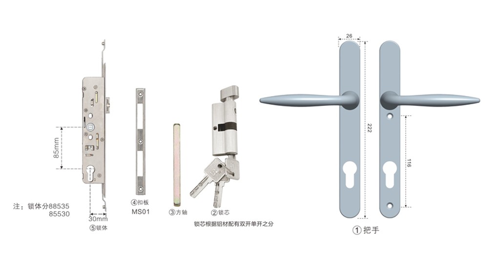 平開門鎖,實用簡潔大方。鎖體連接傳動桿可實現(xiàn)多點鎖。扣板可按客戶需求選配。